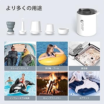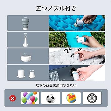 ・【多用途電動エアーポンプ 】-五つのエアノズルを搭載、浮き輪やプール玩具、エアーベット、真空収納袋などに対応し、幅広い用途に対応します。さまざまなインフレニーズに対応します。アウトドアのエアクッション、車のエアクッション、水泳リング、水に浮かぶ列、真空保管袋および他の膨脹可能な製品に適しています。