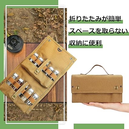 ・【調味料ケース製品仕様】収納バッグ本体:縦12cm横23cm奥行き7cm /広げて縦42.5cm横23cm、重量:184g、材質:キャンバス生地、厚み:16Oz(オンス)。ボトル:10本セット、サイズ:103CM、重量:31g/1本、材質:PET。