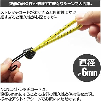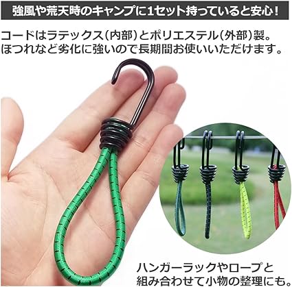 ・太すぎず細すぎない直径6mmのストレッチコードには抜群の耐久性と伸縮性があります。テントやタープ、天幕を固定しているペグとロープの間にプラスすることで、強風、風や揺れなどによる衝撃を吸収し、ロープにかかる負荷を分散。ペグを抜けにくくし、ロープの緩みも軽減してくれます。強風や荒天時のキャンプに1セット持っていると安心!