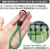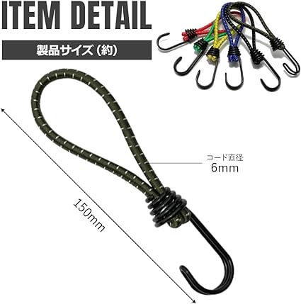 ・長さ(約):150mm、コード直径(約):6mm、フック直径(約):3mm、重量(約):25g、材質:鉄(フック)※防さび加工済み、ラテックス・ポリエステル(コード)、入数:8本