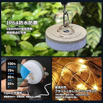 ・【Type-C充電+大容量バッテリー、コードレスで照明&飾り付け】従来のイルミネーションライトではアウトドアで電源がないと使えなく、室内の使用でもケーブルの長さによく困ります。本ランタンは大容量1800mAhバッテリーが搭載し、最大10時間以上にコードレス点灯が可能です。そしてType-C急速充電で3時間フルチャージできます。さらに残り電量表示ライトも付きで、残電一目瞭然。これで電源困りなく、コードレスでアウトドア照明や飾り付けができます。