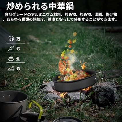 ・3 様々なシーンで活躍 アウトドアキャンプ 自走式釣り ピクニック 寮鍋 調理麺など様々なシーンで活躍 食品グレードのアルミ素材で 揚げ物 炒め物 煮込み料理 揚げ物など様々なシーンで活躍