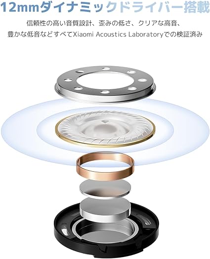 ・クリアな高音とパワフルな低音:迫力の音楽体験を届ける12mmダイナミックドライバー搭載。歪みの低さ、クリアな高音、豊かな低音などすべてXiaomi Acoustics Laboratoryでの検証済み。THD率(全高調波ひずみ率)は0.1%以下という結果が実証されています。