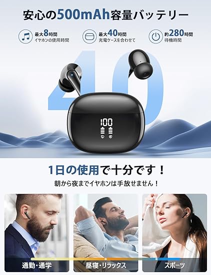・【光沢感のある充電ケース】おだやかな楕円形の充電ケースは、小さなサイズで、女の子でも手のひらに収まります。秀逸な手触り感と輝きを放つように見える風合いが醸し出す上質感がします。充電ケースにある磁気誘導カバーを片手で簡単に開いて、上品な隠しLEDディスプレイが輝きます。LEDディスプレイの数字は、0%から100%まで明確に表示できます。いつでもどこでも充電ケースの残量、またイヤホンの充電状況が一目瞭然!【驚嘆した連続待機時間】イヤホン単体をフル充電すればで8時間以上再生でき、通勤や通学などで時間を気にせず音楽を楽しめます。充電ケースと組み合わせて45時間以上再生でき、長い時間充電せずに使えるので便利です。わずか15分程度の充電で180分間以上再生できる急速充電対応し、充電を忘れてしまっても身支度をしている間に手軽に充電できます。 (※電池劣化を防ぐため、長時間に使用しない場合、定期的に充電ケースに給電してください。)。