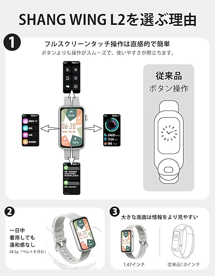 ・「1.47インチ?超軽量?使いやすい」スマートウォッチL2は、1.47インチの長方形のスクリーンを搭載し、解像度は170×320で、文字がクリアで読みやすくなっています。男女兼用で、バンドを含めた重量はわずか28.5gで、一日中付けていても違和感を感じません。タッチスクリーン操作で、アプリ「GloryFit」に接続すれば、簡単に使うことができます。また、このスマートウォッチは、多様なシーンで活躍できます。スポーツ時には運動データを記録し、健康管理に役立ちます。ビジネス時には、通知を受け取ったり、スケジュールを管理したりすることができます。さらに、レジャー時には、音楽コントロールや写真撮影のリモート操作が可能です。このように、様々な場面で活用できるスマートウォッチです。