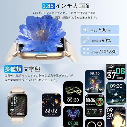・【1.85インチ大画面&文字盤自由設定 】1.85インチの大画面と高解像度などの要素を組み合わせており、3Dサーフェスガラスの工芸に合わせて、より高い解像度の視覚体験とスマートフォンのようなタッチ触感を楽しめ、もっと便利に操作することができます。例のない快適な視覚感と優れた操作感をもたらします。本体で5つの表盤画面搭載、それ以外も、文字盤DIY機能もあり、携帯電話中の写真を利用して、お好きな文字盤を作る事もできます。毎日のお気持ちによって、新たな活力を注ぎます。好きな文字盤スタイルを取り替えましょう。またスマートウォッチは、日本語/英語/韓国語などの多言語を自由に設定することができます。外観のデザインは広く斬新であり、あらゆる年齢層の人に適しています、家族、親友、恋人、自分にプレゼントに最適!