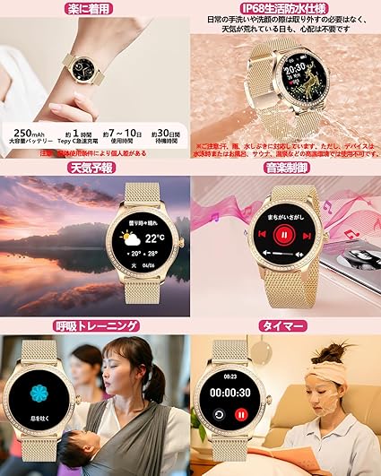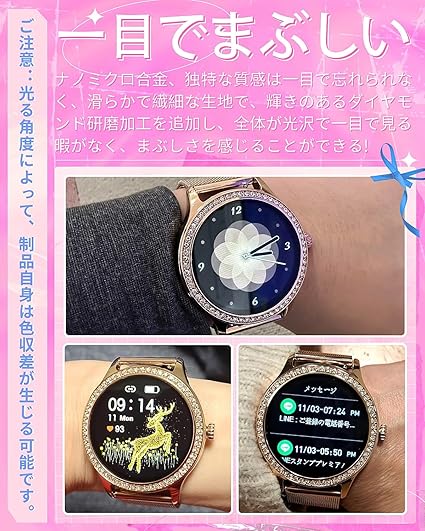 ・【クイックリリース技術・1.28インチ高精細画面でお洒落・精緻な工夫・女性の月経管理】編み網工芸で整えたメッシュは通気と防水の特点の高品質な304高品質ポリッシュドステンレススチールの20mm幅の腕時計 ベルトがクイックリリース技術を利用し、市販のほとんどのブランドのフラットタイプのインターフェース時計と互換性があり、交換工具も要らず、イージークリック式バネ棒を指で横に押せば、時計バンドを数秒で装着でき、ご変更に応じて、時計が新しく、美しくなることができます!1.28インチだけのハイビジョン表示でかわいい!ナノミクロ合金、独特な質感は一目で忘れられなく、滑らかで繊細な生地で、輝きのあるダイヤモンド研磨加工を追加し、全体が光沢で一目で見る暇がなく、まぶしさを感じることができます!きらきらして細部から鍛えて作られ、モダンでスタイリッシュな設計です。特別な時期の加護で、アプリに月経情報を設定したデータをもとに生理周期の開始日と終了日を記録することでき、次回の予想月経日や排卵日などを予測することができ、生理開始リマインダーを設置して、安心させます。レディースにとしてとっても優しい!