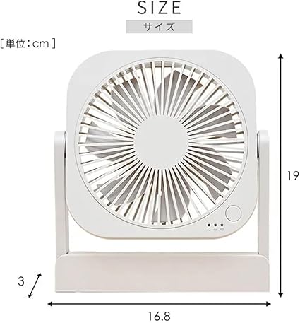 ・【商品仕様】◇本体サイズ:幅16.9×奥行4.1×高さ19cm ◇本体重量:275g ◇電源:コンセント、USB、乾電池(アルカリ単3形乾電池×4本使用) ◇消費電力:約3.5W(最大)※ACアダプタ使用時 ◇風量調節:3段階(弱・中・強) ◇角度調節:上下360°(手動) ◇タイマー:約10時間で自動オフ ◇乾電池にて稼動時の持続時間:弱/16時間、中/6.5時間、強/3時間 ◇付属品:専用ACアダプター、USB電源ケーブル(コード長:約1.3m)、取扱説明書(保証書)