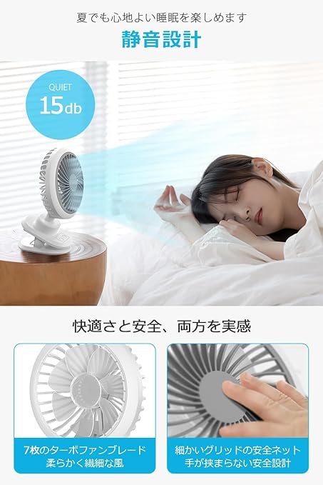 ・【7枚のターボファンブレードで快適な風を提供する携帯クリップファン】7枚のターボファンブレードを備えたこの携帯クリップファンは、従来のファンに比べて柔らかく繊細な風を作り出します。特にエアコンの風が苦手な方や、長時間風に当たり続けたい方におすすめです。体に優しい風で、疲れを感じることなく快適に過ごせます。コンパクトで軽量な設計により、デスクやベッドサイド、アウトドアなど様々な場所に簡単に取り付けられます。