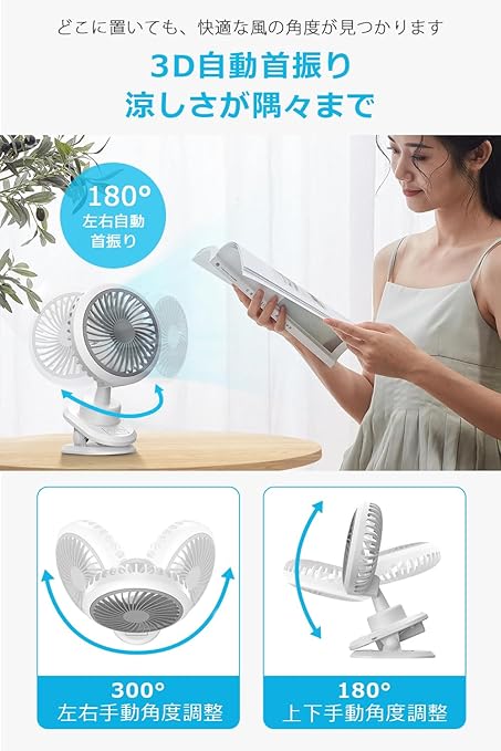 クリップ扇風機 卓上扇風機 充電式 【2024新開発&3D自動首振り&10000mAh電池内蔵】 USB扇風機 65時間使用可 15db静音