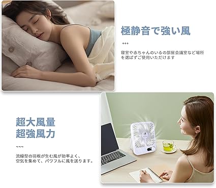 ・【超静音設計&強力な風量】この静音デスクファンには、風抵抗を減らし、使用可能な風量エリアを増やすための5つの曲線状の羽根があります。扇風機は省エネのDCモーター搭載し、弱風30dBの静音設計の為、仕事や就寝時にもおすすめです。猛暑日にエアコンの温度は短時間では下がらない場合、この小型ファンはすぐに気持ちの良い風を送ることができ、またはエアコンに合わせて速めに温度を下げることができます。
