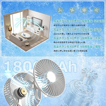 ・?【超低騒音】扇風機作動中、低騒音が実現します。図書館などの静かな場所でも周りの人に迷惑にならないような使用できます。理想的な室内環境を作ります。気になるほどの音はしませんので、良質の睡眠をサピートします。夜でも安心して使えます。 リービング、キッチン、寝室、お風呂場、部屋内の換気、図書館、事務所、職場、会社、オフィス内、ジム、電車、バス、車の中、キャンプ、車中泊、ツーリング、お花見、花火大会、お祭り、バービーキュー、海、海水浴場、プール、ピクニック、エアコンと合わせ使用。