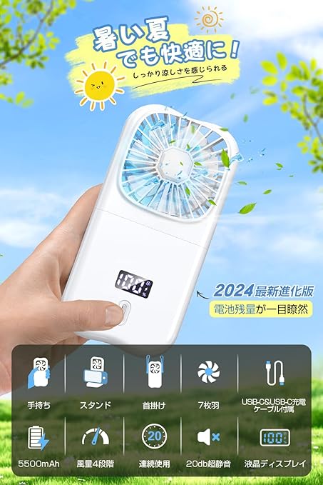 ・年々の暑くなる夏がどのように過ごしますか?手のひらの魔法で夏を瞬間冷却!蒸し暑い夏でもクーラーを持ち歩こう!【5in1機能搭載&マルチシーン対応可能 】手持ちハンディファン ・卓上・クリップ・首掛け扇風機の5タイプ機能を同時に備え、オフィスや自宅など様々なシーンで大活躍。ハンド部分を折り畳んで卓上ファンとなり、付属ストラップを使用したら、両手を使わずにミニハンディファンが使える首掛けタイプとなります。【4段階風量調節可能】気分に合わせて4段階の風量調節機能が搭載し、シーンによってご自由で風量を調節可能です。1段階は睡眠風モードで夜寝る時に邪魔せず柔らかい風を楽しみます。2段階は自然風モードで普通よりさらに細かく微調整できるタイプ、風に敏感な体質の人におすすめます。3〜4段階は中風と強風モードでパワフル送風し、最大回転数3600RPMも装備され、強風モードで猛暑でもより強力、より涼しい風を得られ、野外イベントなどに最適です。
