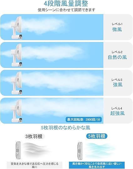 ・【風量4段階調節&電池残量表示】風量は4段階切替えが可能。心地良い微風からパワフルな強風まで使うシーンに合わせてお使い頂ける卓上扇風機です。液晶ディスプレイを搭載し、風量モードとバッテリー残量を液晶上に1%刻みでお知らせており、使うときにバッテリーの残量が無いといった不安を解消します。 さらに充電のタイミングもよく把握できます。