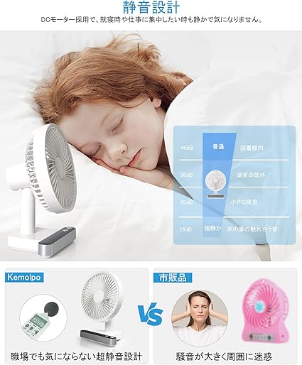 ・【超静音&安定感抜群】静音性にこだわるブラシレスDCモーター搭載で稼働音を効果的に抑えて、弱風運転時の騒音が25dB未満。睡眠時など動作音が気になって眠れない方や、作業中に集中したい方におすすめです。滑り止めのゴムが底部についている置き型なので、デスクワークなど長時間の作業でも安定した冷風を当たってくれます。