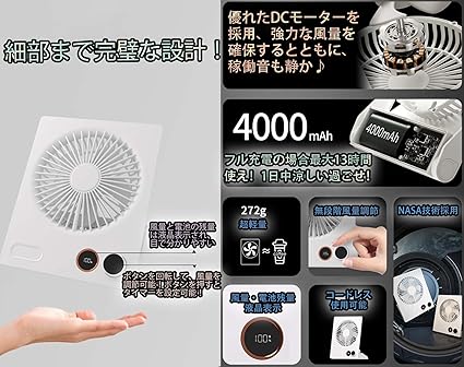 ・【usb充電式・長時間連続使用可能】デスク扇風機は4000mAhの大容量バッテリー内蔵、フル充電した後コードレスで最大約13時間の連続使用可能です。小型扇風機の背面にはType-C充電ポートがあり、付属のUSBケーブルでパソコン、コンセント、モバイルバッテリー、車載などのUSBポートに差し込むだけで簡単に充電できます。