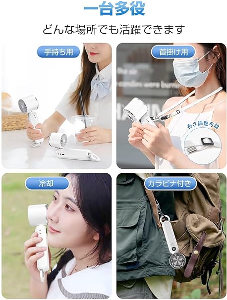 ・【ストラップ付き・カラビナ付き、首掛け・卓上として使用可能】本品はストラップが付属しています。さらに扇風機のヘッド部は90°調整可能で、首掛け扇風機または卓上扇風機として使用することが可能です。カラビナ付きで、バッグなどに掛けることが可能で、収納が便利です。