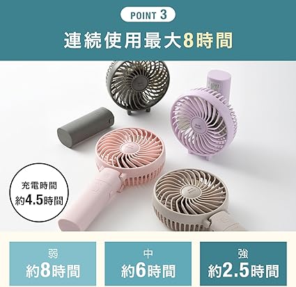 ・連続使用時間:約2.5〜8時間、風量3段階切替(弱/中/強)、手持・卓上兼用型、モバイルバッテリー(2,200mAh)