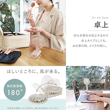 ・【心地よい風をいつでも】かわいいだけじゃない、実力派ハンディファン。1台で手持ちファン、首掛けファン、卓上ファン、スマホスタンドなど◎また、持ち歩きを想定し、約110gの超軽量を実現しました。コンビニのおにぎりと同じ軽さです。