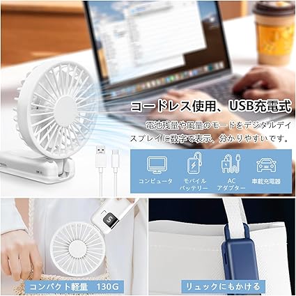 ・【コンパクトサイズ&省エネ扇風機】この携帯扇風機のサイズは約幅9.3×奥行3.8×高さ21.5cm、重さ約130g(本体+台座+携帯用ストラップ)、コンパクトなのでバッグにすっぽり収納でき、リュックなどにぶら下げて持ち運ぶにも楽しいです。3.5時間のフル充電で、最大8時間(1階段の場合)まで連続送風可能、バッグや車に常備し、いつでもどこでも涼しさを手に入れます。