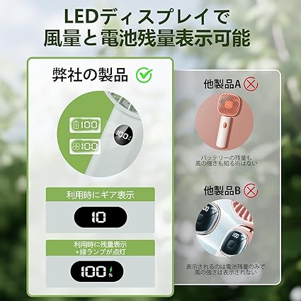 ・【LED液晶で風量・バッテリー残量表示】LEDディスプレイで風量段階とバッテリーが一目で分かるフレンドリー設計。バッテリーがスマホのような100%で表示するので、ランプ式よりバッテリー残量を細かく把握でき、扇風機の充電タイミングも分かりやすくなります。