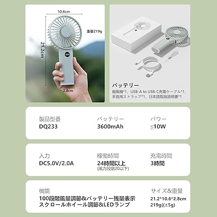 ・【バッテリー容量3600mAh?24時間連続使用】安全PCB回路基板と独立したリチウム電池を採用し、過充電、過放電、短絡を回避し、使用寿命を延長する上安全性を確保できます。内蔵バッテリー容量は3600mAhで、弱モードでは最大24時間連続稼働可能、フル充電は僅か3〜4時間かかり、消費電力を低減できる省エネハンディ扇風機です。 (注:充電中に以下の事を守ってください:?@必ず付属の充電ケーブルをご使用ください。?A必ず5v/2Aもしくは5v/1Aの外部電源と接続してください。)