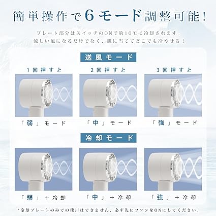 ・【6枚羽/静音/低振動】送風モードは全部で6モード(送風モード3パターン/送風+冷却モード3パターン)!送風+冷却モードはよりひんやりと♪独自の高速モーターを採用している為、まるでドライヤーのような送風感!6枚羽でしっかり風を感じていただけます。独自開発ならではの『騒音低減&振動低減技術』によりどの場面でも問題なくご使用いただけます。