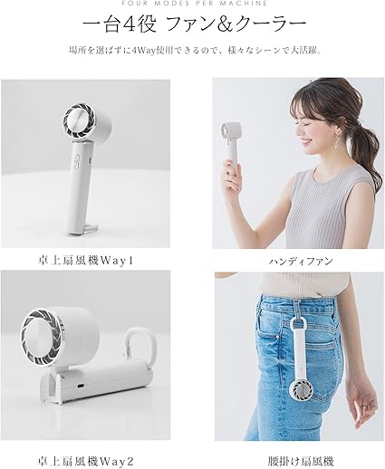 ・【冷却プレート付き/携帯扇風機 新登場】当製品は冷却プレート付きの携帯扇風機で、手持ち扇風機・卓上扇風機(2パターン)・腰掛け扇風機の機能を兼ね備えています。ハンディファンとしてご使用いただく際、軽量なので長時間使っても疲れにくく、作業中やスポーツなどの場でも気軽にご使用いただけます。【冷却プレート】プレート部分はスイッチ1つでON・OFF可能。ONにすると約10℃に冷却されます。プレート部分を肌に当てると瞬間ひんやり!【角度調節】90°角度調節が可能なので自分の好みに合わせて角度を調整できます。