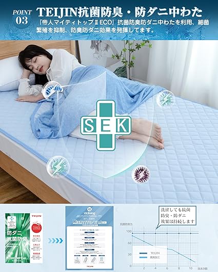 ・【TEIJIN抗菌防臭】 湿気や汗でジメジメする夏は、菌が繁殖しやすい季節です。中わたにテイジンの機能繊維「マイティトップII ECO」を使用する。抗菌防臭・防ダニ効果で安心。低ホルムアルデヒドなのでお子様にも安心。洗濯しても抗菌防臭・防ダニ効果は持続します。