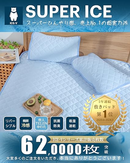 ・【ICE-Vシリーズ】人気のICE-Vシリーズ、今年で6周年!4年連続敷きパッド第1位、掛け布団第1位、タオルケット第1位、3冠達成!合計62萬枚突破!大変多くのご注文をいただき、本当にありがとうございます。