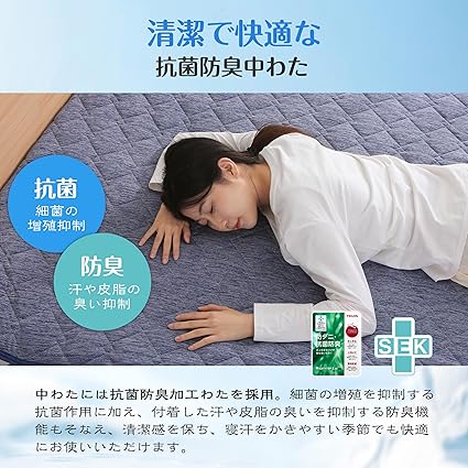 ・【SEK認証・TEIJIN(帝人)抗菌防臭シリーズ】中わたには防ダニ・抗菌防臭性に優れたTEIJIN(帝人)のマイティトップ?U(R)ECOわたを採用。効果は品質試験でも実証されており、細菌の増殖を抑制し、付着した汗や皮脂の臭いを抑制するので清潔感を保ち快適にお使い頂けます。