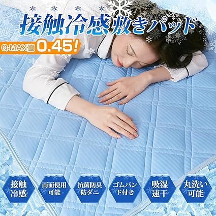 ・【超冷感持続・Q-MAX値は0.45】暑さで寝苦しくなる夏の時期におすすめの接触冷感敷きパッド。熱伝導により触れた部分がひんやり感じる接触冷感素材です。表地はQ-MAX値0.45のコンタクトクール生地を使用しており、肌に触れるとすぐに涼しくなり、夏でも快適に使用できる。冷房なしの時にすごく役立ち、エコで快適な睡眠をゲット!冷房や扇風機などと一緒に使用してひんやり感がアップし、超おすすめですので、ぜひ試してみてください。