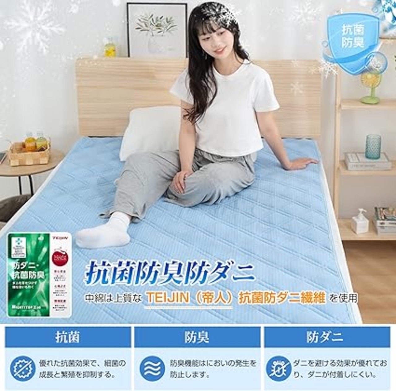 ・【商品情報】シングルサイズ:約幅100cm*奥行200cm 【素材】表地:Q-MAX値は0.45の新型接触冷感生地(ナイロン100%)裏地:ワッフル生地(ポリエステル100%)中綿:上質なTEIJIN(帝人)中綿を使用し、品質が保障されている。 四隅ズレ防止ゴムバンド付き、置くだけ簡単。【メーカー保証】初期不良対応 :お客様を満足させるように努めていきますので、万が一、製品不良などがあった場合は、保証対象となりますのでお気軽にお問い合わせください。弊社にご連絡いただければ迅速に対応いたします。安心してお買い求め頂けます。