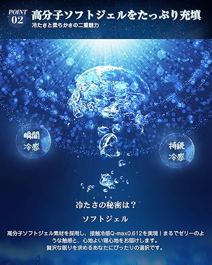 ・【Q-max0.612・持続冷感】水分をたっぷり含んだジェルがゆっくりと体の熱を吸収するため、身体を冷やしすぎることなく、ひんやり感が長く続きます。冷蔵庫に入れる手間もありません。エアコンの温度を下げる必要もなく、節電しながら快適な睡眠をお楽しみいただけます。