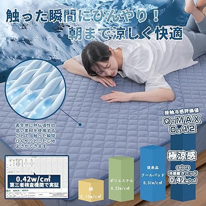 ・【接触冷感!ひんやりした肌触りの表生地】Q-MAX0.42熱伝導性の高い素材を使用することで、触った瞬間ひんやりとした心地よさがあります。冷房や扇風機などを併用すると、さらにひんやりと気持ちよくお使いいただけます。