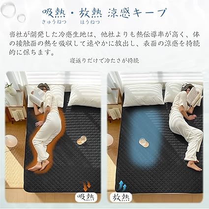 ・【接触冷感Q-MAX0.43!ひんやり!】Q-MAX0.43熱伝導性がより高い生地を使用することで、冷感基準値0.2と比べ2倍以上の強冷感効果を実現し、触れる瞬間にひんやり感を感じます。真夏の寝苦しい夜にも涼しく感じをお楽しんで、気持ちよく眠れます。冷房を併用すると、さらにひんやりを感じます。