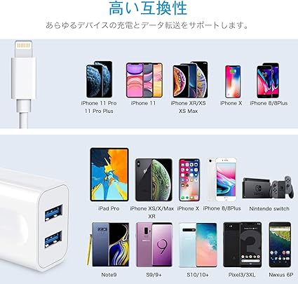 ・【ライトニングケーブル付き】1M アイフォン用 Lightningケーブル 2本を備えて、高品質の4芯銅線を採用し、普通のケーブルより約2倍(2.4A)のスピードで充電が可能で、効率的に充電時間を節約します。最も耐久性優れるPVCで作られて、数千回以上の折り曲げテストに合格しました。