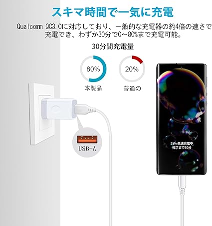 ・【スマート充電機能付き・全世界利用可能】QC3.0技術と出力自動判別スマートチップにより、接続されたデバイスに応じ、自動的に最適な電流で出力します。例えば、QC3.0技術搭載したデバイスに対して、18W/3A Maxの充電速さで急速充電できますし、QC2.0技術搭載したデバイスに対して、QC2.0相当のスピード(2.4A Maxの充電速さ)で高速充電ができます。又、100-240Vの広い電圧に対応しているので、家、オフィスだけでなく、海外出張、旅行にも適用です。