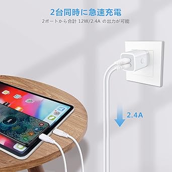 ・【2USBポート充電・スマート充電】:usb充電器は2ポート搭載、2台のスマホを同時に充電可能です。アダプター合計最大出力12W/2.4A。しかも、自動判別機能を搭載しますので、接続されたデバイスに最適な電流で充電します。iPhoneやAndroidの機種を自動判別するため、どのポートを使用してもフルスピードに充電します。(単ポートを使用する場合は2.4Aです。2ポートを使用したら、出力は1A+1.4Aになります)。