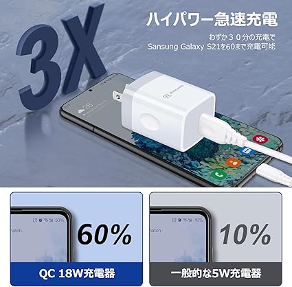 USB 急速充電器/Type-C ケーブル セット [18W/QC3.0急速充電対応/PSE認証] Android アンドロイド充電器 us