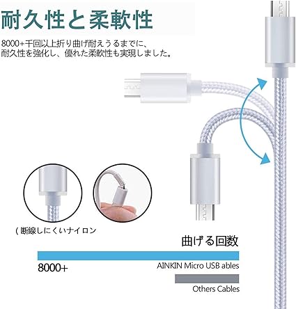 ・【2mマイクロUSBケーブル】Ailkinケーブルでいつでもどこでも急速充電や高速データ転送が可能です。USB2.0規格の480Mbps伝送スピードで本ケーブルの伝導性を最大限に実現、データ損失を最小限に抑えます。高品質のナイロン編みによるケーブルは手触りがよく、耐久性もより高いです。
