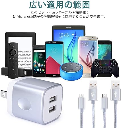・【パッケージ内容】Micro usbケーブル(2m/1本)と2ポートUSB充電器(1個)。