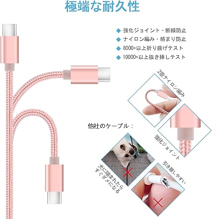 ・【高耐久Type C USBケーブル】外部には厳選された素材が優れたナイロンによって作られて、柔軟性がよく丈夫になります。10000回以上の折り曲げテストに合格しており、そのため劣化しにくく、内部には無酸素銅、アルミ箔などは耐磨耗性に優れて、長年にわたり御愛用頂けます。しかも、根元の部分にも耐久性を考慮するように、断線しにくい丈夫なつくりの充電コードです。90cmの長さで、車載、寝室、ソファ、バルコニーなどの各シーンに満足できます。