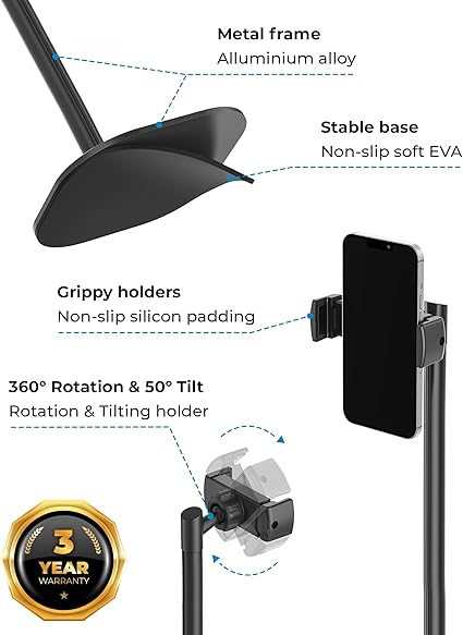 ・安定感抜群の携帯スタンド 広いスタンドベース設計でぐらつきを軽減、クリップ式のスマホホルダーでスマホのずれや落下も防止 ※ご利用いただきやすいようにグリップ部分を改善いたしました!両サイドのグリップはスライドできません。片側のみスライドしてデバイスを挟みます。