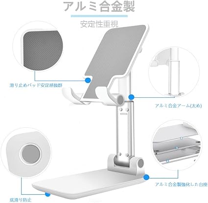 ・【耐久性】この卓上スマホスタンドのスマホ置き台と基盤は高品質のABS素材、柱はアルミ合金素材を採用されたので、錆びにくくて耐久性に優れていて、重量感があり安定して使えます。