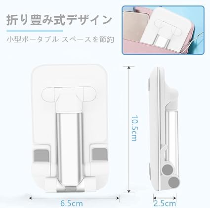 ・【折りたたみ式・持ち運びやすい】折りたたむと手のひらに収まるほどのサイズ感でポケットに入りやすい小型モバイルスタンドです。省スペース性に優れ、外出や旅行時にも手軽に持ち運べます。(折りたたみサイズ:10.5cm*6.5cm*2.5cm)