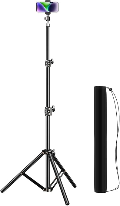 ・【2.1M自由伸縮】スマホ三脚スタンドは高さ70cmから210cmまで自由に伸縮できます。録画、撮影、会議など、様々なニーズに対応できます。【パッケージ内容】2.1M炭素合金鋼三脚×1、金属ボール雲台×1、1/4インチ穴ホルダー×1、収納袋×1。