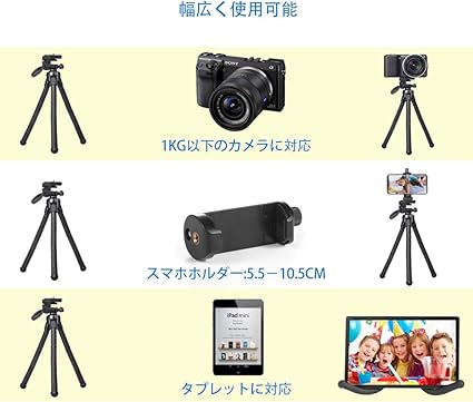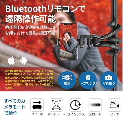 ・【幅広く対応】くねくねスマホ三脚は1/4ネジが付き、1kgまでのカメラ、スマホに対応します。タブレットホルダーとしても使えます。また、スマホ用リモコンが付くことで、スマホを約10m遠距離コントロールできます。リモコンは技術基準適合証明認証済で、ご安心に使用ください。【ご注意】 最初Bluetoothにペアリングし、リモコンボタンを押したら、シャッター機能ではなく音量が上がるやズーム機能になる場合、カメラ画面の設定から音量ボタンやズームボタンをシャッターに変更すれば正常なシャッター機能になります。