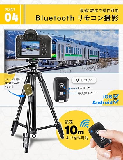 ・【メーカーについて】:弊社は10年以上の撮影用機材(特に三脚)の開発と製造経験を持つ工場です。お客様にベストな三脚と24ヶ月サービスを提供することが弊社の追求となっております。お荷物をお届けする前、商品を全般的に細かく検査することを行いますが、万が一何か不具合(初期不良、破損、キズ)がございました場合、是非お気軽にカスタマーサポートまでご連絡下さい(24時間内に返事致します・日本語サービス有り)。(※全部のネジを取り外せますので、不良ではないご了承ください。)パッケージ内容:三脚本体(リモコン付き)×1、収納袋×1、スマホとiPad両用ホルダー×1、日本語の取扱説明書×1。