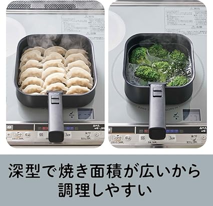 毎日使うものだから、料理をもっと楽しく、収納をもっと簡単に。四角いカタチだからスッとたって、スッととって、スッとお料理。機能性と収納性に優れたフライパンの新しいカタチ。